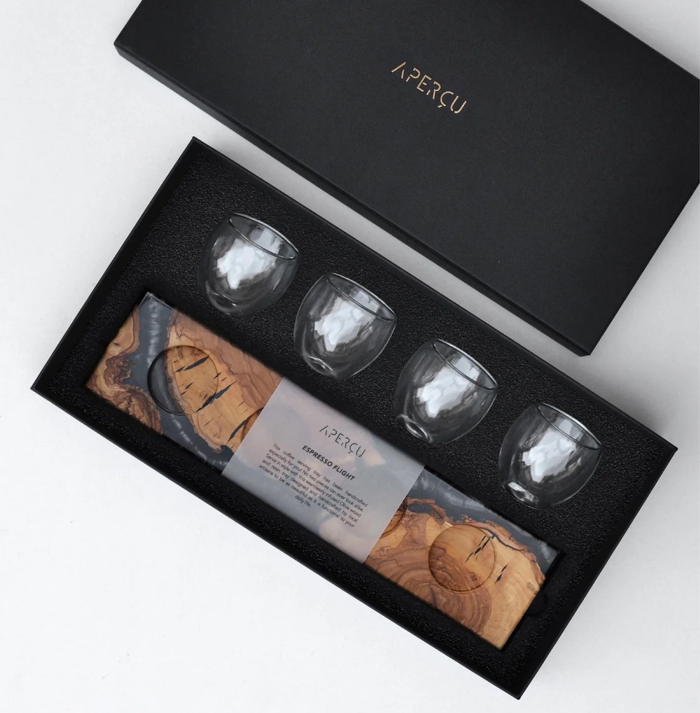 Olive wood and pearl white/black resin tray with 4 double glass espresso cups