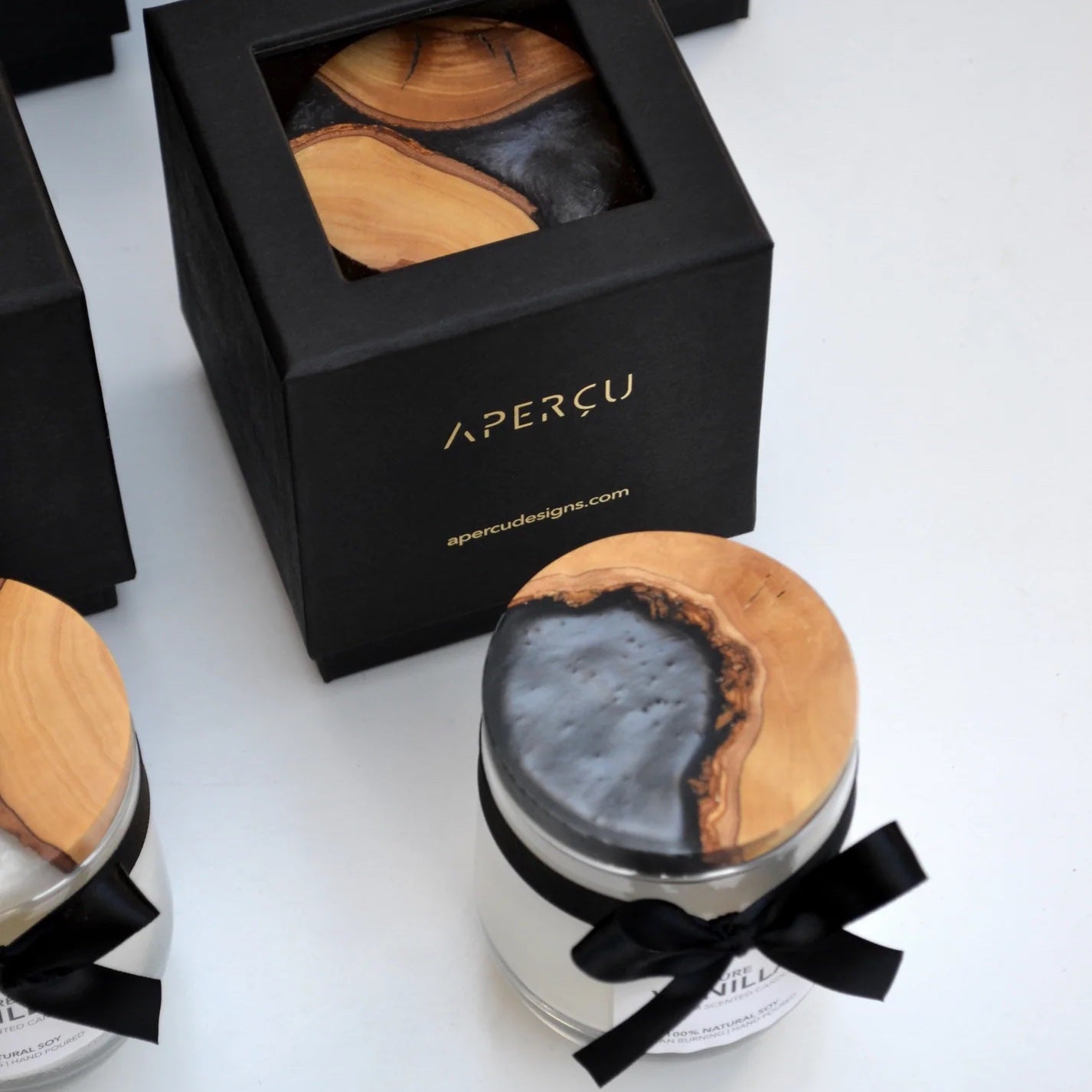 Soy wax candle with olive wood and pearl white/black resin cover.