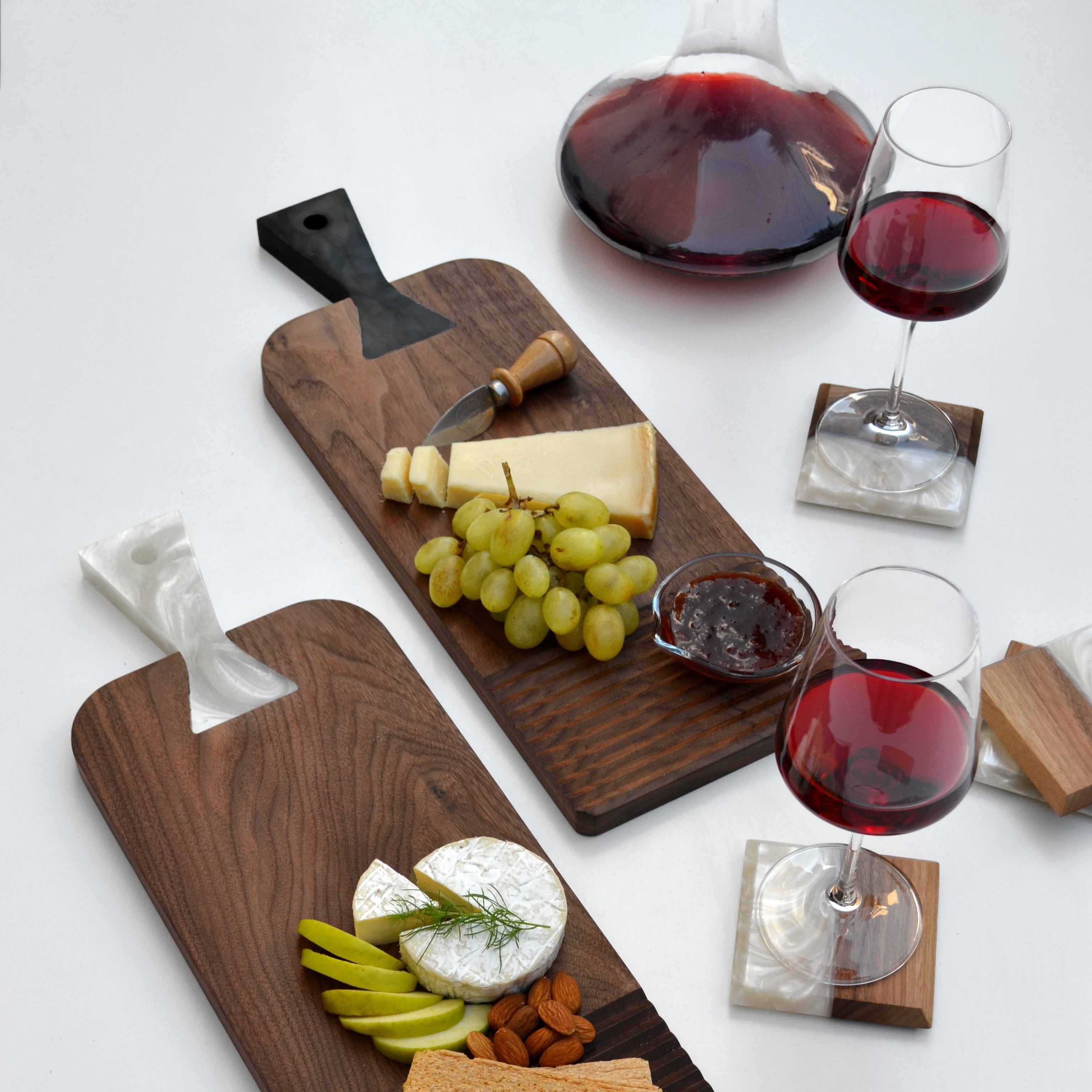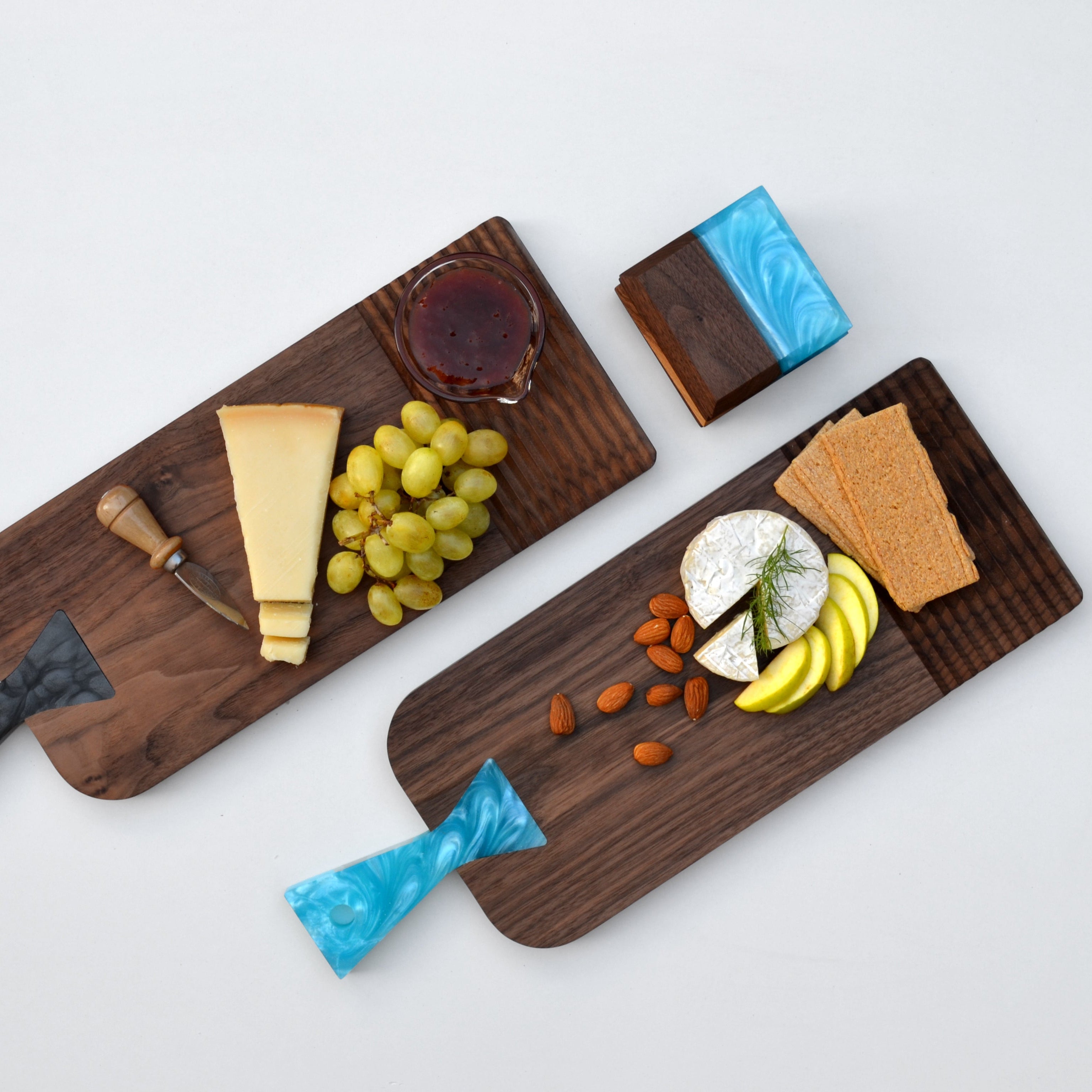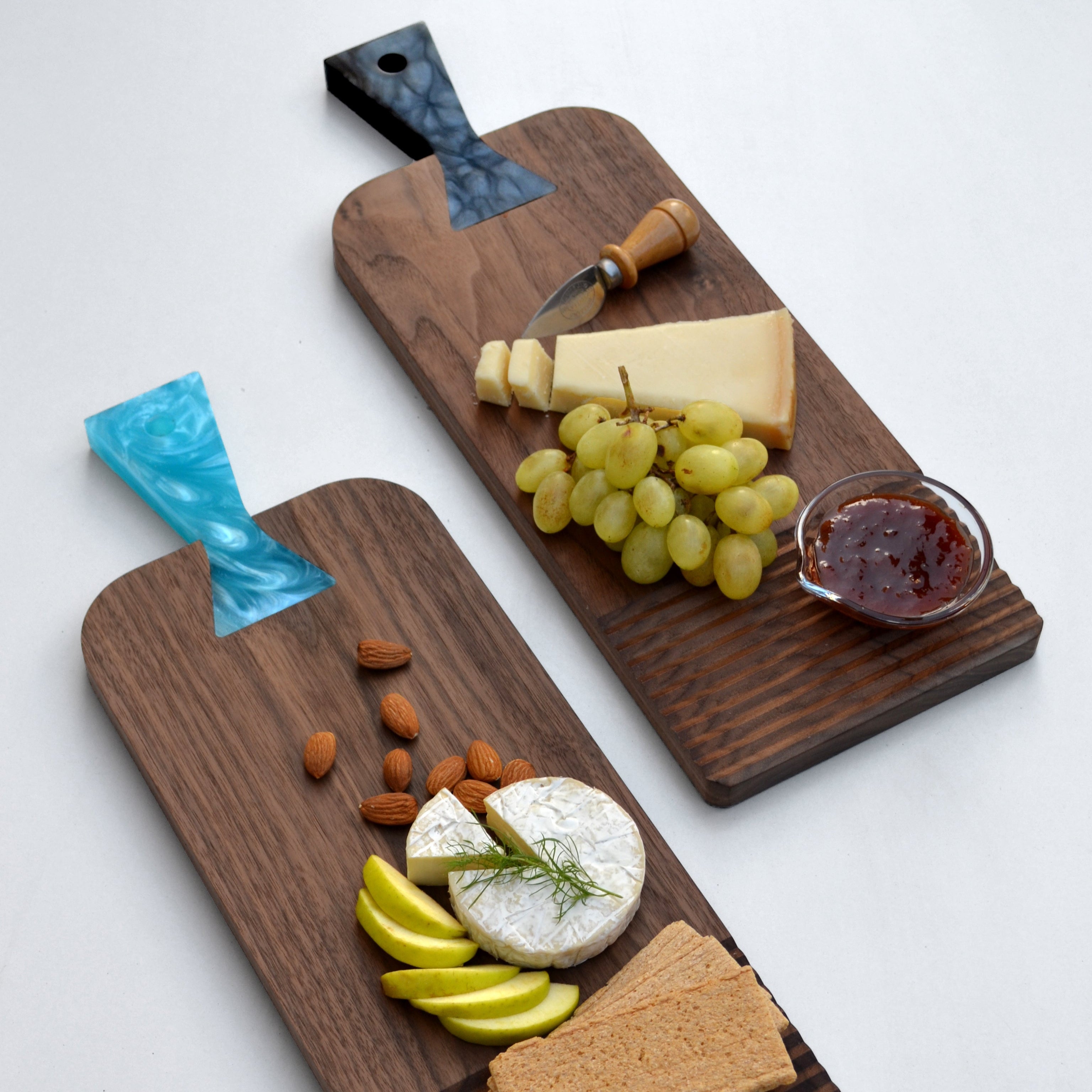This serving platter is made of sustainably sourced walnut wood and epoxy resin handle. The wood surface is finished with %100 food safe mineral oil and beeswax, ideally formulated to help protect your board.